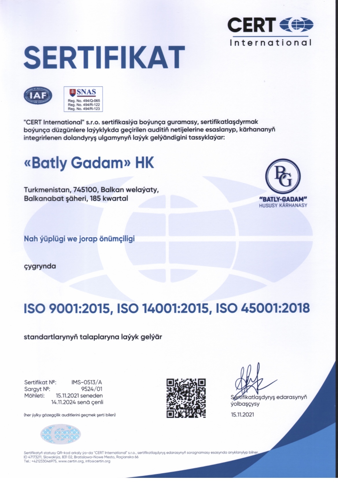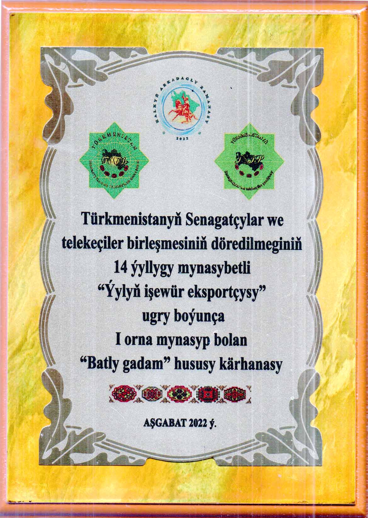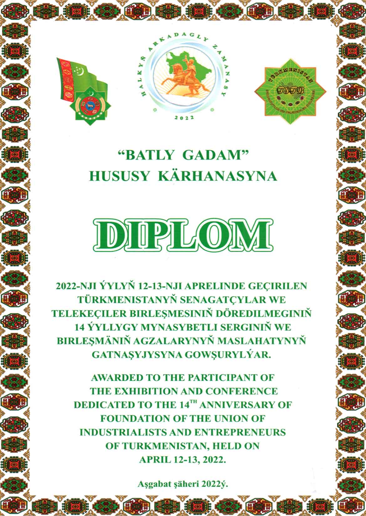 2022-nji ýylda Türkmenistanyň Senagatçylar we telekeçiler birleşmesiniň döredilmeginiň 14-ýyllygy mynasybetli “Ýylyň işewür eksportçysy” ugry boýunça “Batly-Gadam” hususy kärhanasy 1-nji orna mynasyp boldy, şeýle hem şol ýylyň 12-13-nji aprelinde geçirilen Türkmenistanyň Senagatçylar we telekeçiler birleşmesiniň sergisiniň agzalaryna gowşurylýan diplom bilen sylaglandyryldy.
