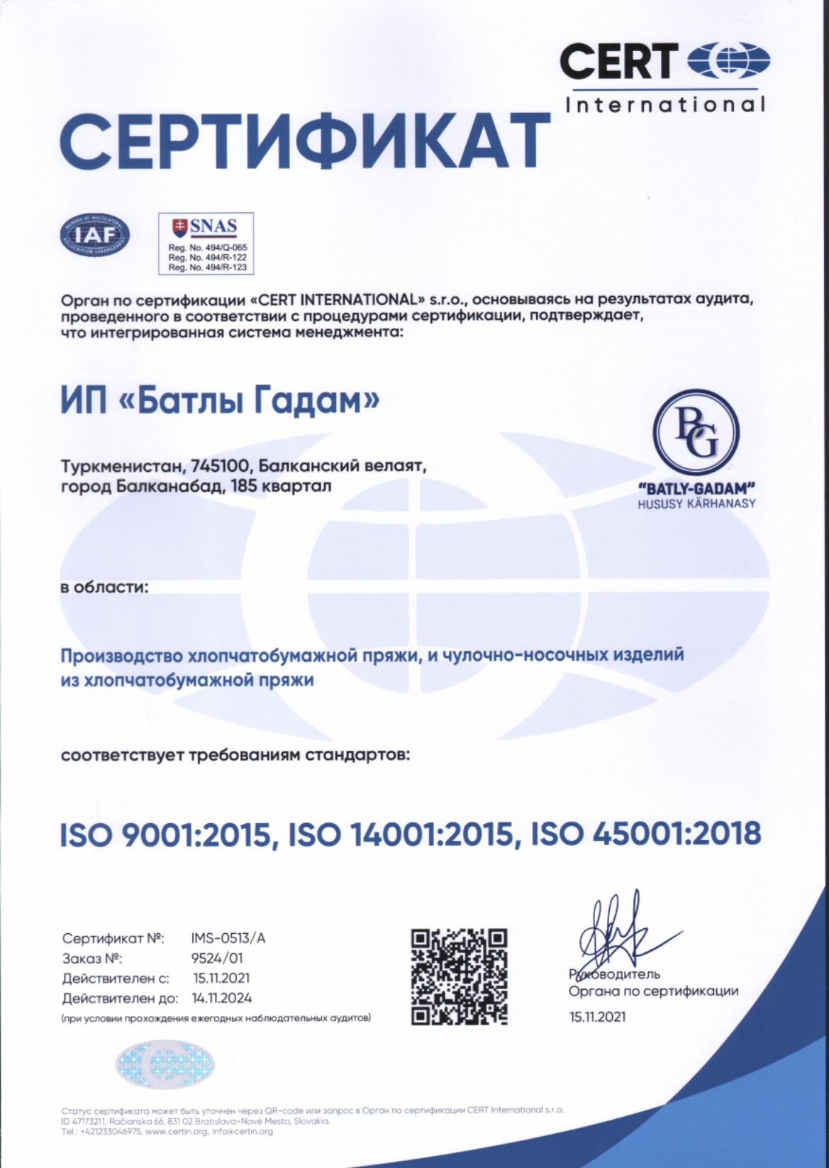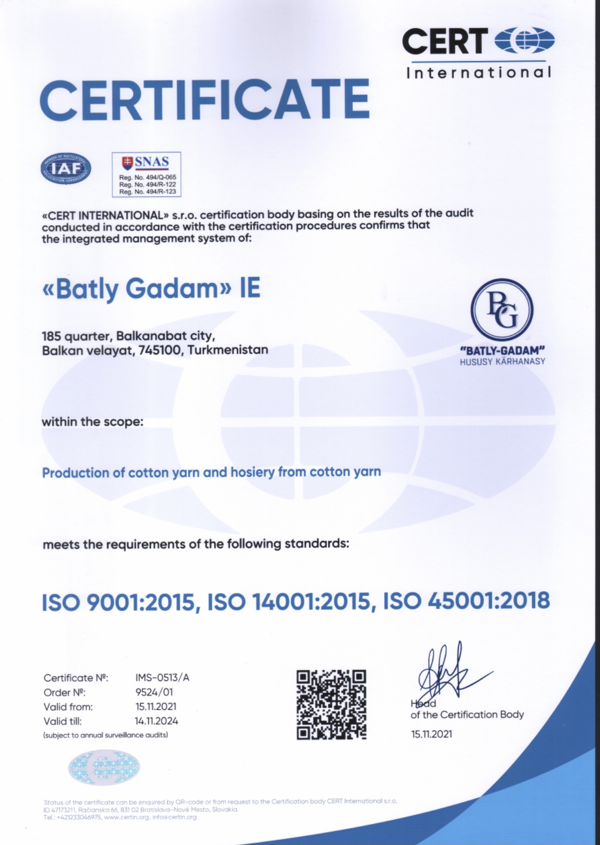 Guramanyň esasy ugry, alyp barýan işini hemişe ýokarlandyryp, sarp edijiler, kärhananyň işgärleri, pagta ýüplügi we jorap önümçiliginde hil dolandyryşy, daşky gurşawy we saglygy goramak şeýle hem zähmet howpsuzlygy bilen gyzyklanýan beýleki taraplar tarapyndan ykrar edilmekdir. Önümiň ömrüniň ähli tapgyrlarynda, çig mal satyn almakdan başlap, ulanyşdan galan taýýar önümleri ýok etmeklige çenli TDU (toplumlaýyn dolandyryş ulgamy) ulanmak hökmanydyr.